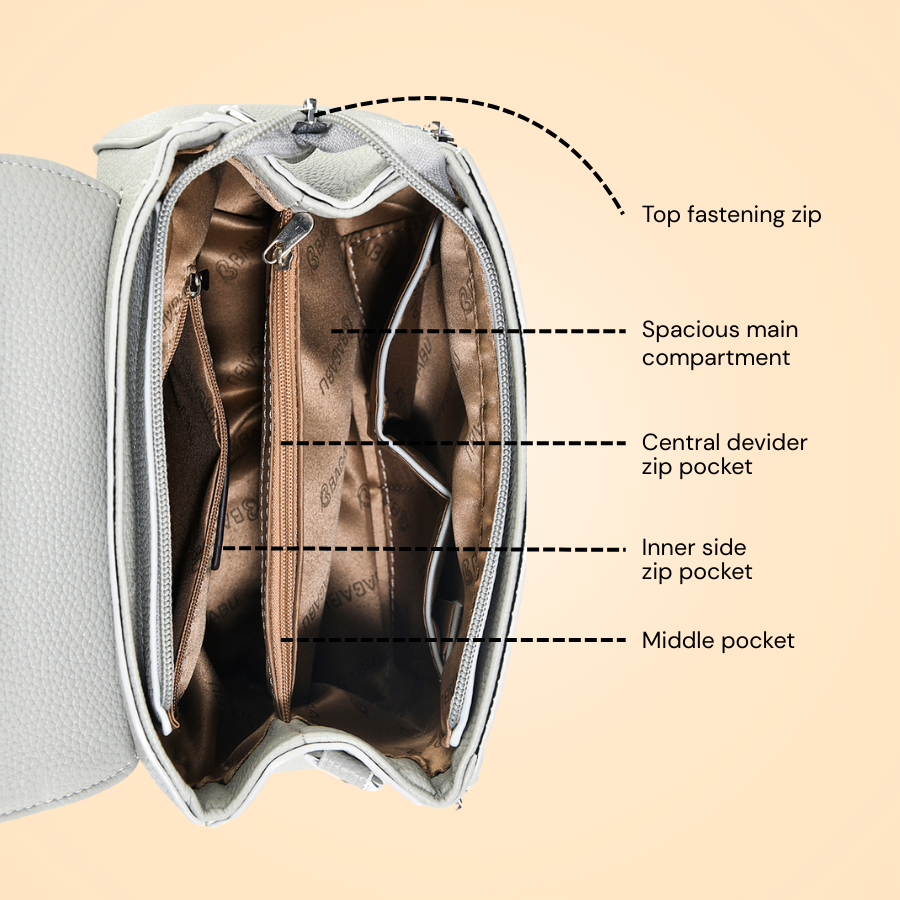 Interior:Spacious main compartment with inner zipper and slip pockets