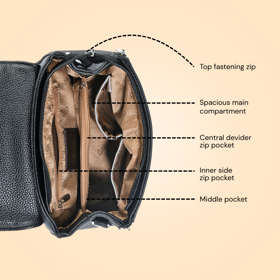 Interior:Spacious main compartment with inner zipper and slip pockets