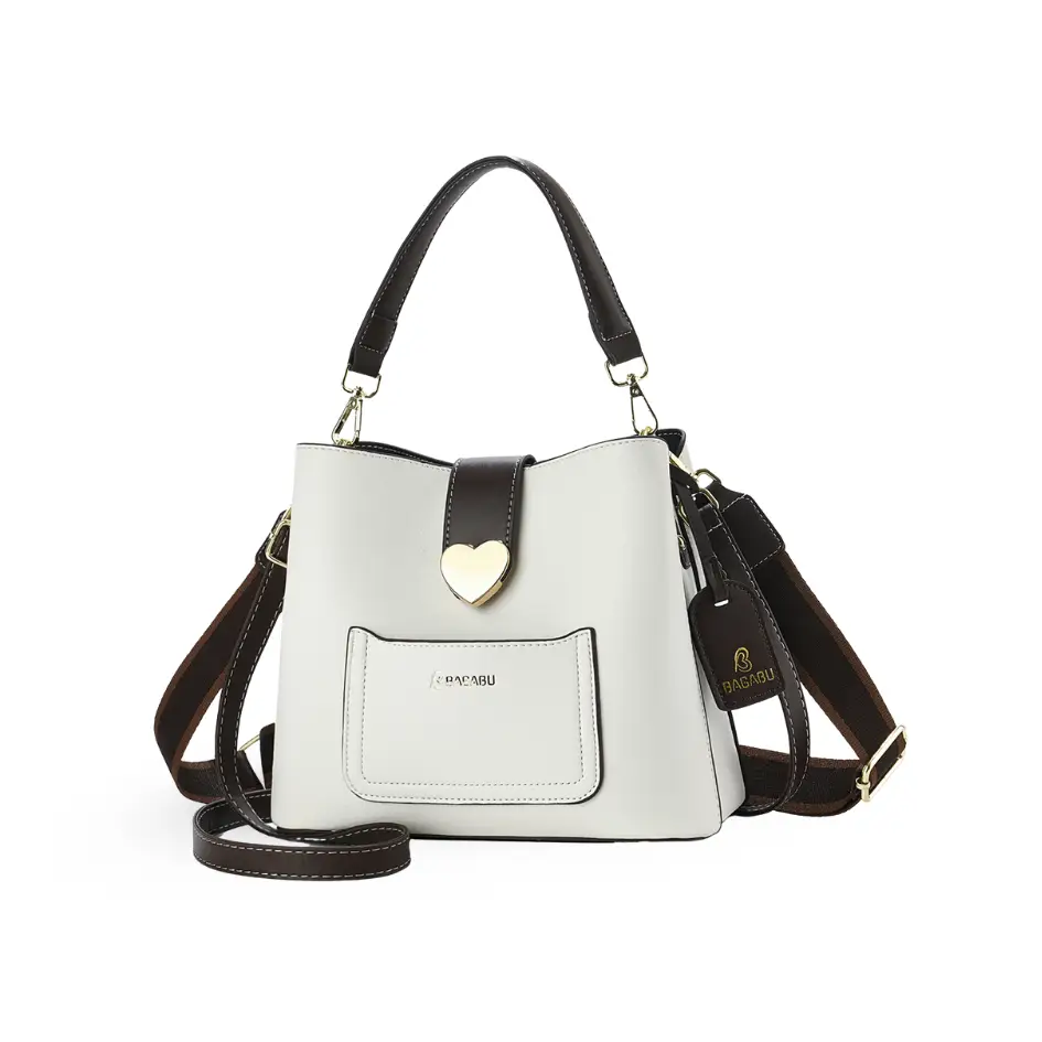 Design: Contemporary bucket-style with smooth texture and front pocket detail